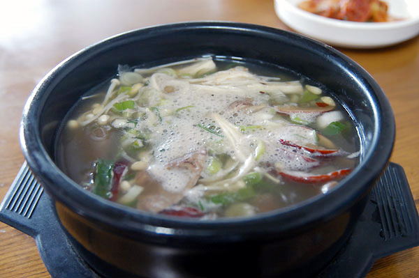 こんな高霊郡に疲れや二日酔いなどによいどんぐりの料理・どんぐりすいとん鍋が美味しい食堂があります。牛の脊椎骨を長時間にかけてじっくりと煮込んだスープに薄きりの牛肉、高麗人参、ナツメ、エノキダケ、銀杏、松の実などの材料をたっぷり入れて煮込むすいとん鍋は、いろんな味と香りが染み付いた栄養食です。