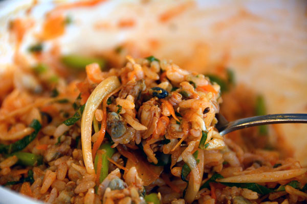 양배추와 미나리, 당근 등의 야채와 재첩 생선회가 듬뿍 들어 있어 밥을 넣어 비비면 상당한 양이 됩니다. 소식하시는 분들은 재첩국 정식을 추천합니다.