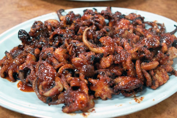 매콤 달콤한 주꾸미 구이는 한국 소주 안주로도 제격입니다.