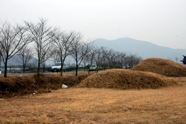 KTX 신경주역에서 경주시 건천읍 방향으로 향하는 평지에 크고 작은 30여 개의 신라 고분들이 모여 있습니다. 본격적인 발굴조사는 이루어지지 않았지만 1952년에 파괴된 고분 2기를 조사했는데, 평지에 나무 방을 만들고 그 위를 강에서 주워 온 둥근 돌을 쌓아 점토로 다져 바깥을 둥글게 성토한 신라 특유의 적석목곽분이라는 사실이 확인되었습니다.