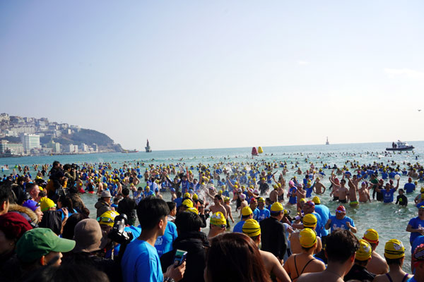 こんにちは、新年を祝う毎年恒例の寒中水泳大会が釜山海雲台海水浴場で開催されました。2019年1月6日(日曜日)、釜山海雲台で開催された第32回北極グマ水泳大会では、例年に比べて、今年の冬は暖かい日が続いているようですが、多くの水泳愛好者の方々が参加し、冬の釜山の海に飛び込んで水泳したりして一年の家内安全や健康などを祈りました。