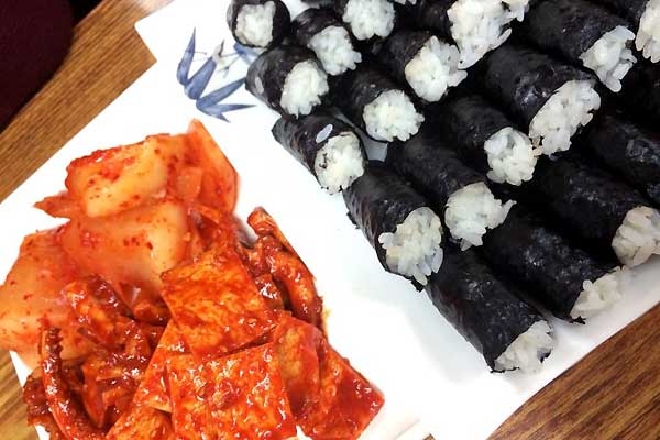 韓国の一般のキンパッ(海苔巻き)とは違って何の味も付けてない生海苔の上に白ご飯だけをのせて人差し指の大きさで巻いた海苔巻きにコチュジャン味とからまったかまぼことイカ、食べやすい大きさに切った大根キムチ(カクテキ)と一緒に食べる。