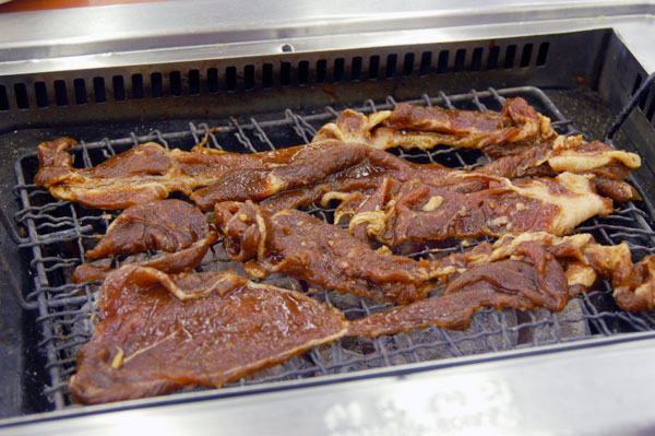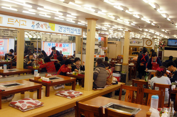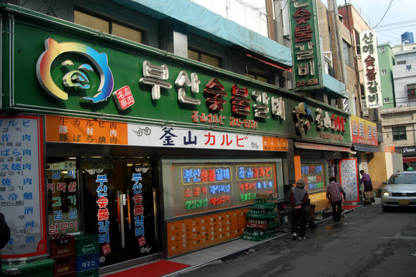 そのアリラン通りの奥のほうに何軒の焼肉専門店が集まっていますが、そのうち、釜山炭火カルビ(プサンスップルカルビ)という豚の焼肉が旨い食堂があります。