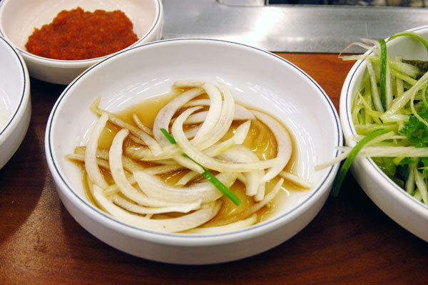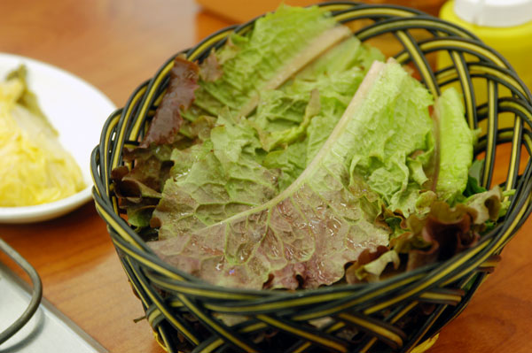 この店の豚肉は、生三枚肉、生モクサル(首肉)、モクサル(首肉)がありますが、薄くスライスしたモクサルお肉を甘辛タレに絡めて炭火で焼くモクサル(首肉)がもっとも人気があるメニューです。 いい色に焼かれたモクサルにパチェムチム(ネギを千切りして和えたもの)やサンチュ(チシャ)に巻いて食べましたらお肉が柔らかくて美味しいです。