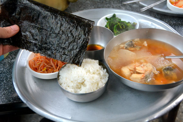 小さな食堂の看板メニューは、朝市から届けてくれる新鮮なスケトウダラに塩、唐辛子粉、大根、ニンニクだけで味を出したトンテチゲですが、このほかにもビビンパ、韓国風のインスタントラーメンもありますので、お好みに合わせて注文することができます。