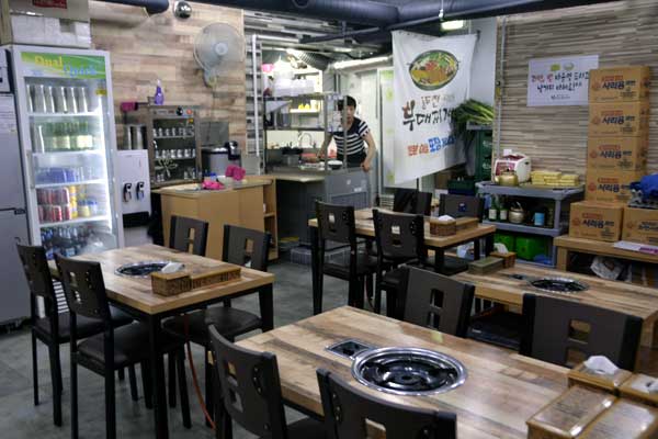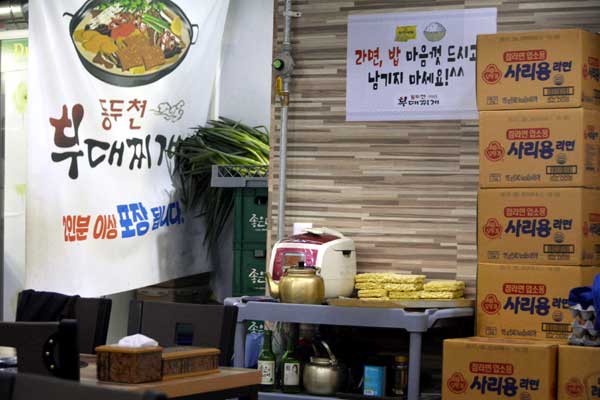 식당 Menu는부대찌개 하나 뿐이지만 스팸, 치즈, 베이컨, 만두, 우동, 수제비 등의 토핑 추가 Menu도 있으며 밥과 라면은 무한 리필이 가능합니다.