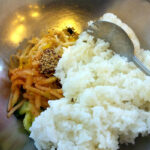 Put rice in a bowl of bean sprouts, seaweed, shredded radish, and zucchini sprouts and mix them with red pepper paste.