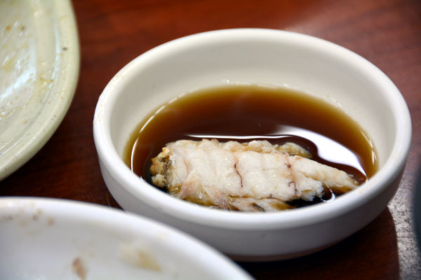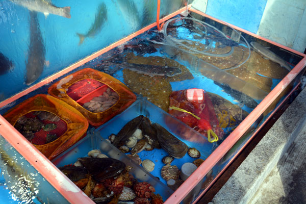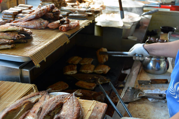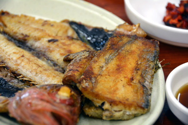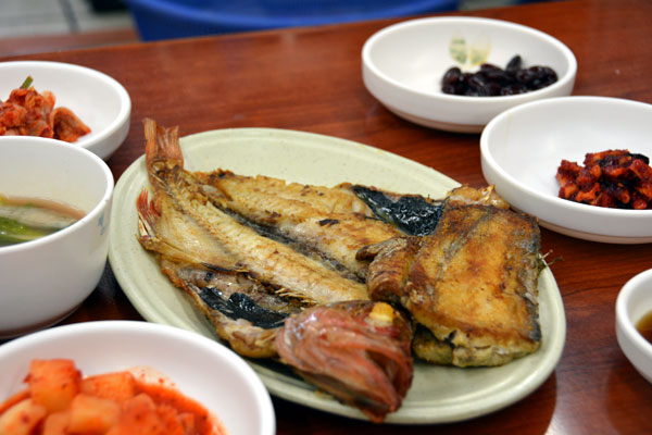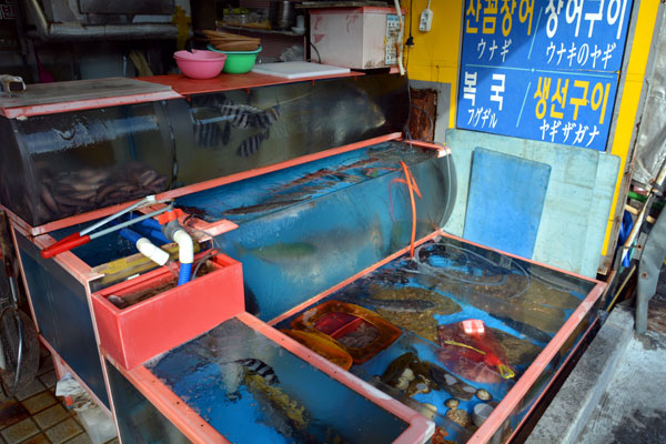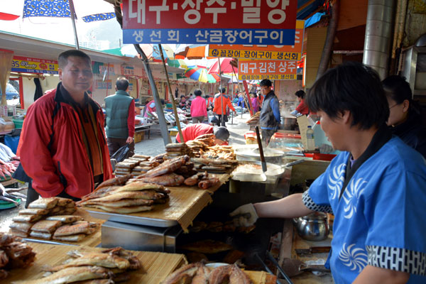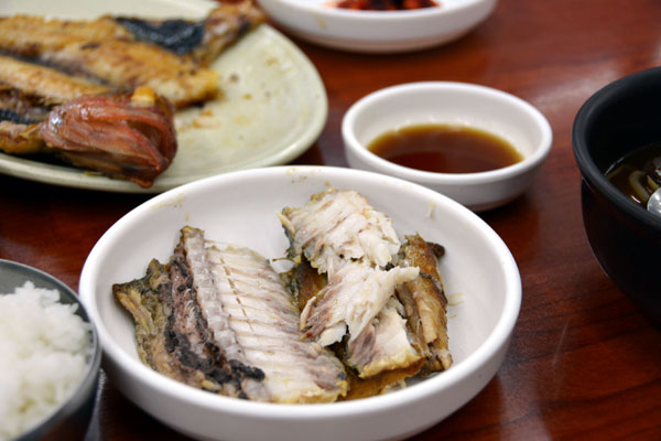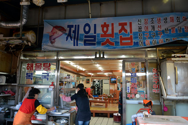 Behind Shindonga Seafood Market in Jagalchi Market, you can see restaurants baking fish on a large iron plate after a minute’s walk along the crowded market alley of shoppers and fish shops, and I’ll briefly introduce Jeil Sasimi Restaurant among them.
