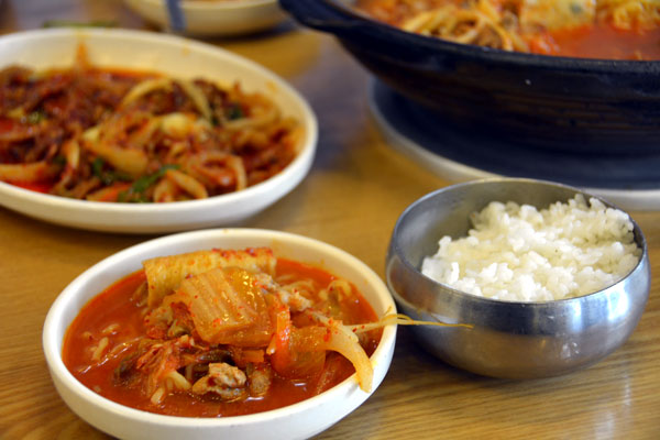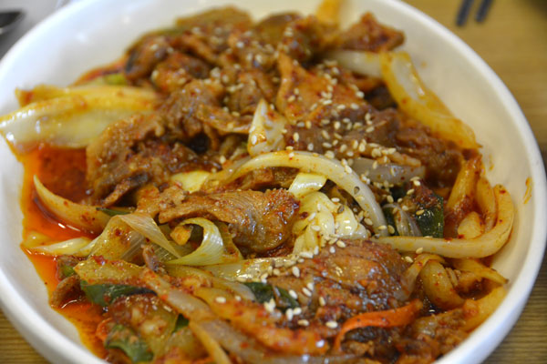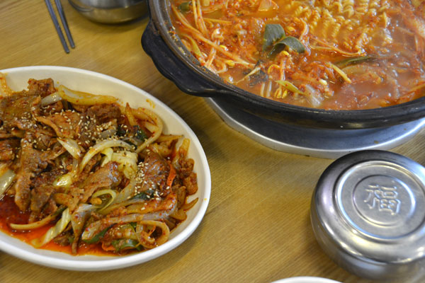 Stir-fried pork with plum extract, aged kimchi, and steamed pork are delicious because the pork is really soft. It’s a small restaurant with 6 tables and 3 menus, but it’s right next to the international market, so please stop by for shopping.