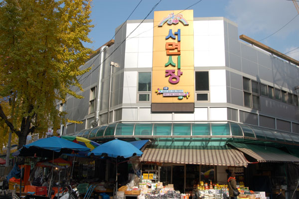 In Seomyeon Market, shops such as flower shops, vegetable shops, dried fish shops, and ginseng shops, as well as kalguksu restaurants, soondae, chicken, and fish cakes stop people from coming and going.