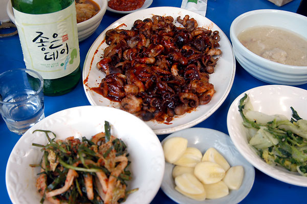 The spicy grilled jukkumi is perfect as a snack with Korean soju.