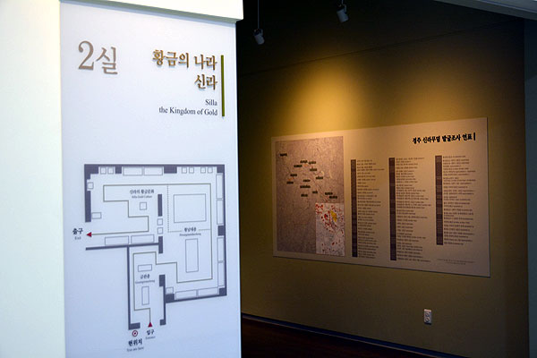 The Silla History Museum, which is the main building of the Gyeongju Museum, exhibits various relics under the themes of the founding and growth of Silla in Room 1, the golden kingdom in Room 2, the kingdom of strong kings in Room 3, and the prosperity and fall of Shilla in Room 4. In particular, exhibition room 2 is filled with various golden relics and Silla earthenware excavated from the southern tomb of Hwangnamdaechong, Cheonmachong, and Geumgwanchong in downtown Gyeongju.