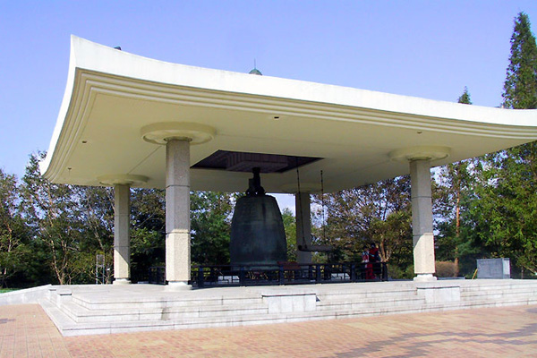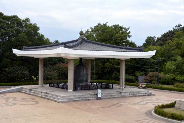 King Seongdeok’s Bell (National Treasure No. 29) hanging in the garden yard of Gyeongju Museum.