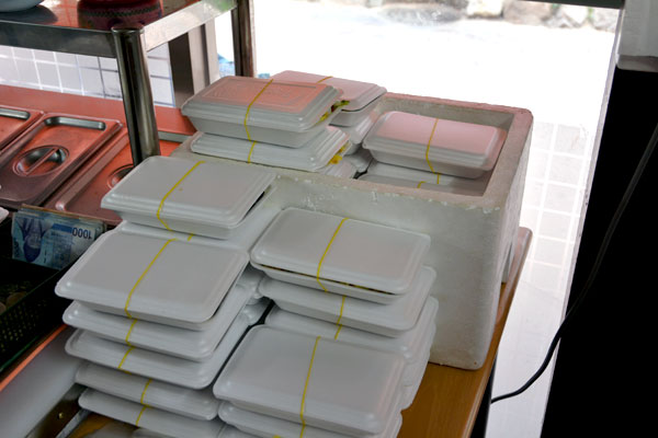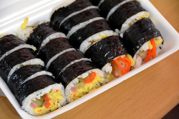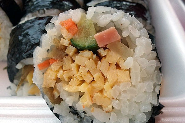 キムパッのMiddle身は、70パーセントが錦糸卵になっており、ハム、ニンジン、キュウリ、ゴボウ、タクアンが薄く切られ、飽きのこない薄味の庶民的なキムパッです。 キムパッの値段は、一本が3,500Wonですが、注文は、最低2本以上の注文となっています。