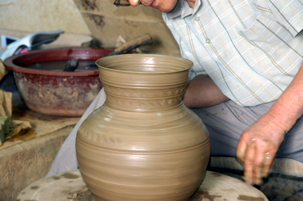 新羅土器は、慶州近所にある粘り気のある粘土をロクロの上に置き、足でけってまわしながら薄い牛の皮などを使って作られた様々な形や文様を持つ土器を風や日が当たらない場所で乾かし、うわ薬をかけないまま、登り窯で4泊5日間にわたって1,200度から1,300度の高熱で薪で焼き続けます。