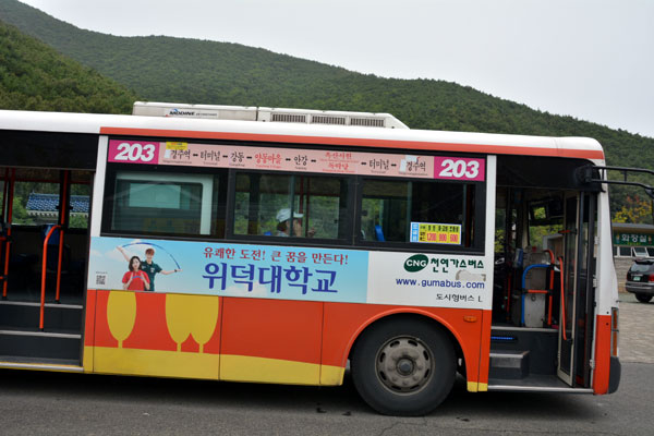 慶州駅⇔慶州市外バスターミナル⇔カンドン⇔良洞村⇔アンガン⇔玉山書院、独楽堂⇔慶州市外バスターミナル⇔慶州駅を運行する203番市内バスを利用します。