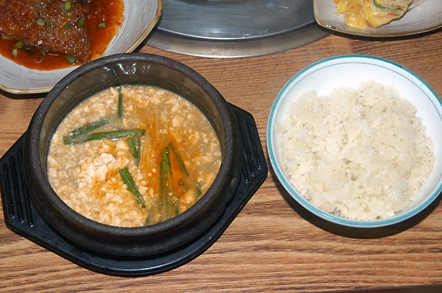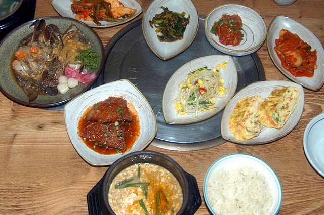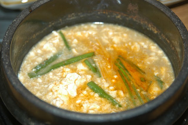 이 집의 메인 요리인 대게장 순두부를 주문하고 잠시 기다리면 따끈따끈한 철판에 갓 구운 김치전이 나옵니다. 김치전을 다 먹고 나면 산에서 길어온 명수를 넣어 지은 노란끼를 띠는 돌솥밥, 굴젓, 배추김치, 구운 두부, 숙주나물, 무잎등 밥상에 일곱 가지 정도의 반찬이 밥상에 놓입니다.