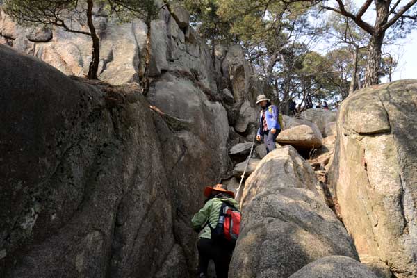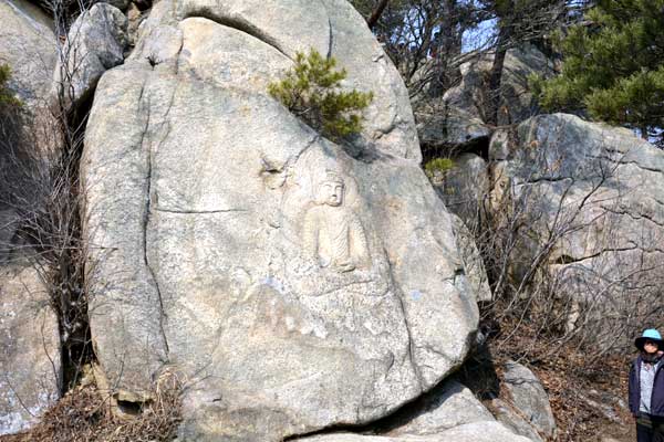 To climb the Yongjangsa Temple Site stone pagoda, you can follow the hiking guide ribbon tied to the branches. When I finally reach the peak, the Seated Stone Buddha (Treasure No. 187) and the Seated Rock-carved Buddha (Treasure No. 913) welcome me.