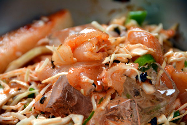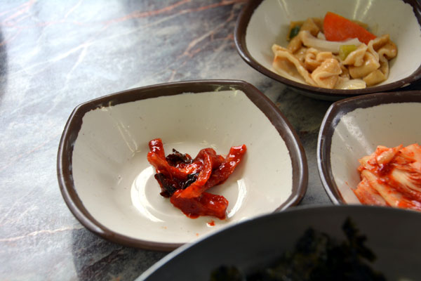 この食堂のムルフェは、大きい器に新鮮な刺身と、キャベツ、キュウリ、大根、梨などの野菜を盛り、海苔、胡麻、酢コチュジャンなどの薬味を加えたムルフェです。また、その上に素麺、 氷、コップ半分くらいの肉水を入れて、かき混ぜて食べますが、付け合わせとして、魚の辛いスープのメウンタンもいただけます。冷たいムルフェを食べ、熱々のメウンタン鍋はいかがでしょうか