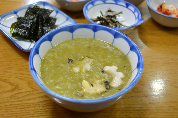 この店は、朝食定番メニューのアワビ粥のほかにアワビの蒸し焼き、アワビのバター焼き、アワビラーメン、アワビの刺身、アワビ海鮮トゥッペギなどのアワビ料理と、うにわかめスープ、アマダイ焼き定食、カルチジョリム(タチウオの甘辛煮)、カルチグイ(タチウオの塩焼き)などの海鮮料理もあります。