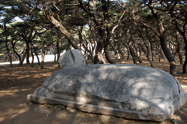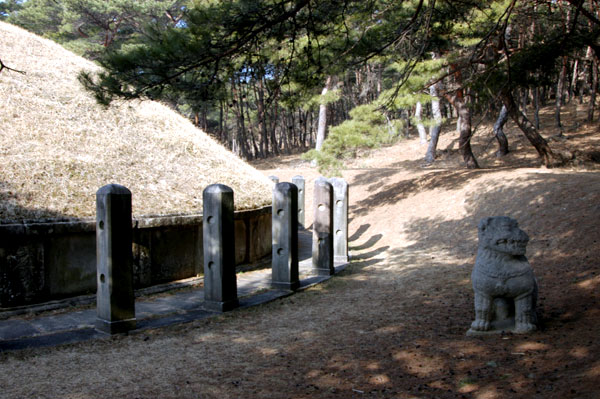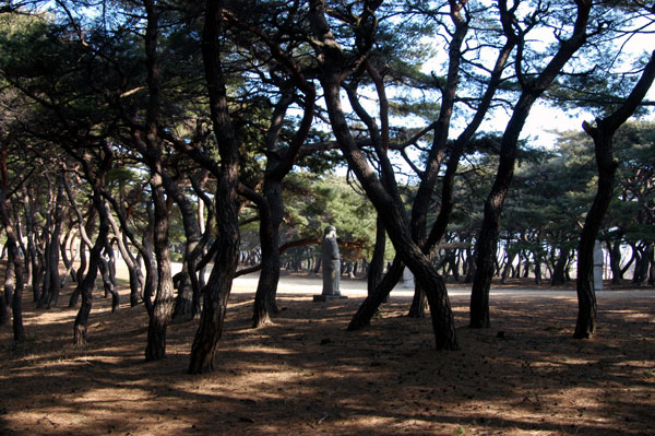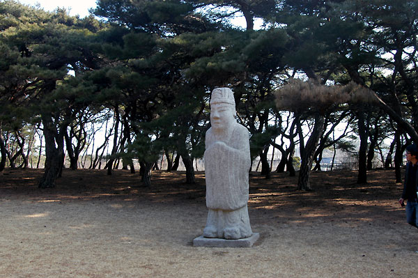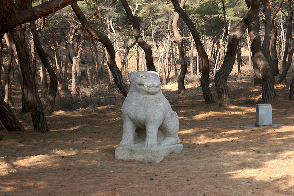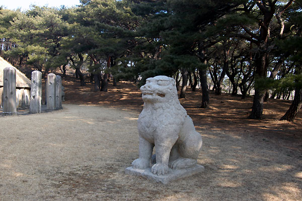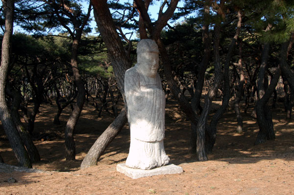 青々の生い茂る立派な松の森を抜けていくとアラビア人の顔をしている武人像の2体と文人像の2体が向かい合っている広い芝生が現れ、芝生の向こうに十二支神像の護石をめぐらせた円墳の史跡30号の興德王陵が目に入ります。周りの長さ65メートル、直径22.2メートル、高さ6.4メートルの王陵の四方には4体の獅子像が王陵を保護するように正々堂々に立っています。