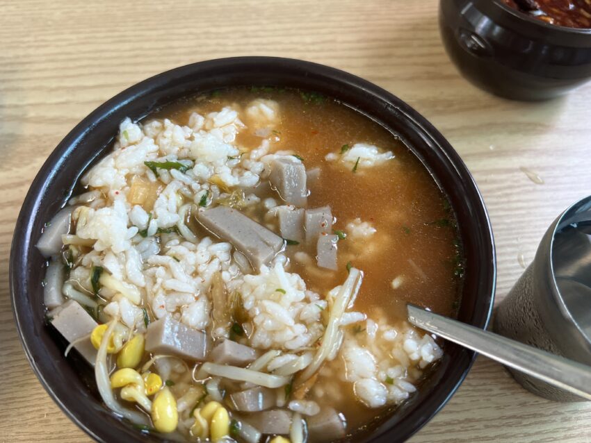 韓国は地方によって様々な酔い覚ましスープがありますが、慶州の八友亭ヘジャンクッは、干し明太と干しエビ、煮干し、昆布を使った出汁に茹でた豆もやし、蕎麦寒天のメミルムッ、海の海藻であるモジャバン、すっぱいキムチを入れ、ニンニクのみじん切りとごま油などで味付けをし、独特な味のヘジャンクッが味わえます。