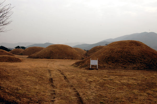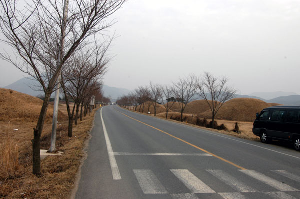 KTX新慶州駅から慶州市 乾川邑(コンチョンウッ)方面へ 向かう平地に大小30余あまりの新羅時代の古墳が集まっています。本格的な発掘調査は行われていませんが、1952年に破壊された古墳2基を調査しましたが、平地に木の部屋を作り、その上を川から拾ってきた丸い小石を積み上げて粘土で固め、外側を丸く盛り土した新羅特有の積石木槨墳と言うことが確認されました。