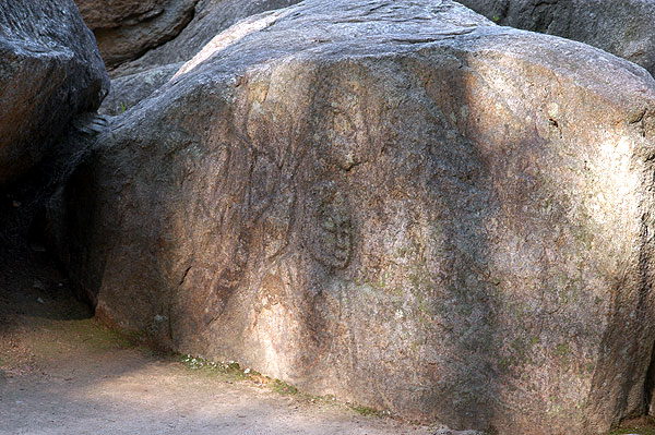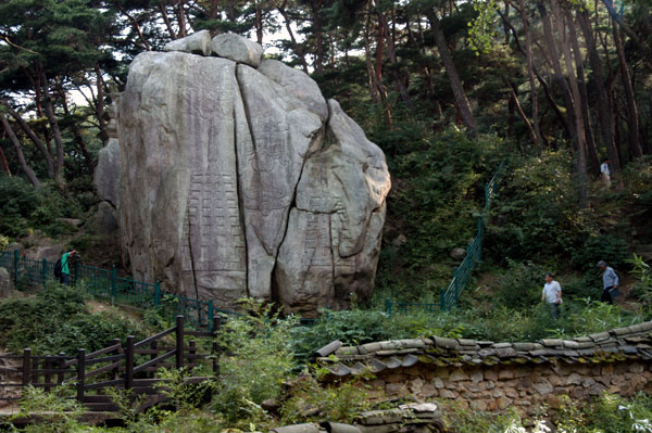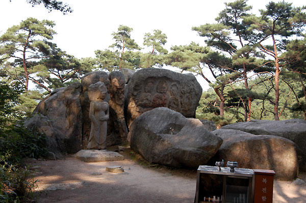 東の斜面をのぼると南面は平坦な高台になっており、三重石塔と岩に刻まれている三尊仏坐像、高さ2メートルくらいの丸彫りの菩薩立像がありますが、菩薩立像の左手が腹部を撫でていることからお産の神様として婦人の信仰対象になったとか。塔谷の名の由来は、ここの三重石塔もしくは北面の岩の表面に薄く刻まれている塔からちなんだものだといわれており、「神印寺」という銘瓦が発見されて「神印寺址」と呼ばれたりもします。
