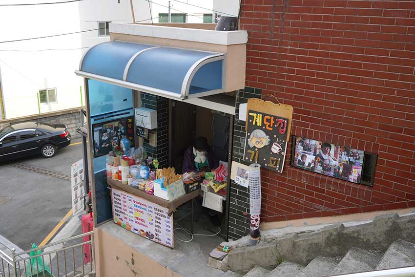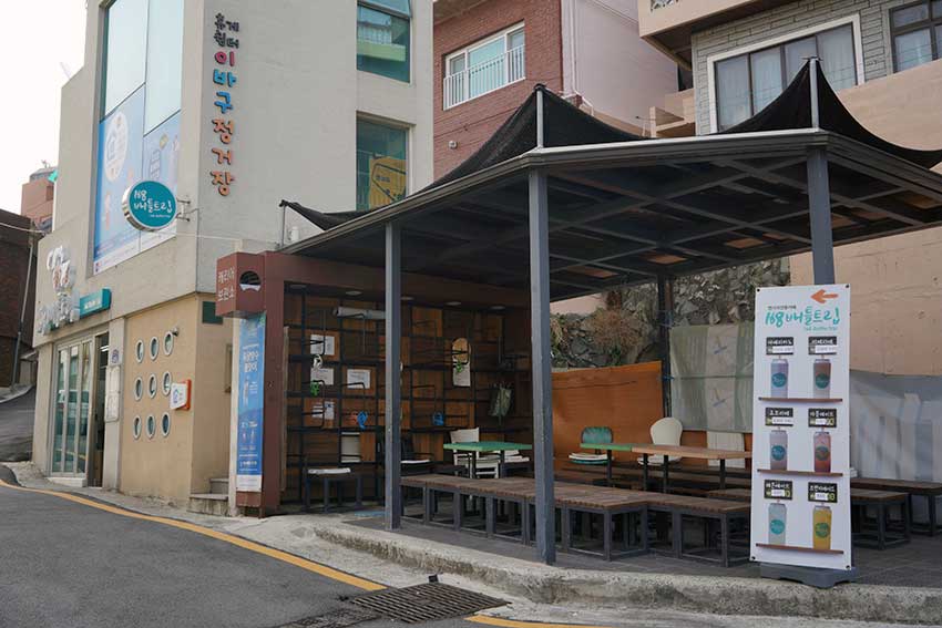 초량 이바구길 산 중턱 산복도로로 올라가기 전에 잠시 쉬어가는 이바구 정거장이 있습니다. 이곳에는 168배틀트립이라는 카페와 야외 휴게소가 있으며 계단 중간에는 믹스 커피를 파는 자그마한 계단집도 있습니다.