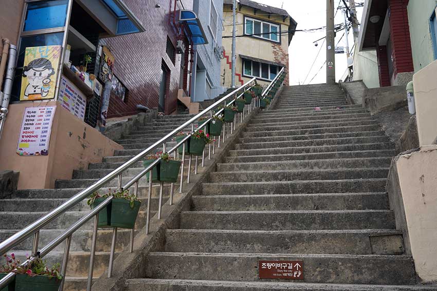 초량초등학교와 1892년 한강 이남에 최초로 설립된 초량교회 사이에 있는 인물사 담장 길을 쭉 따라 올라가면 초량 이바구길 168계단 모노레일이 나와요.