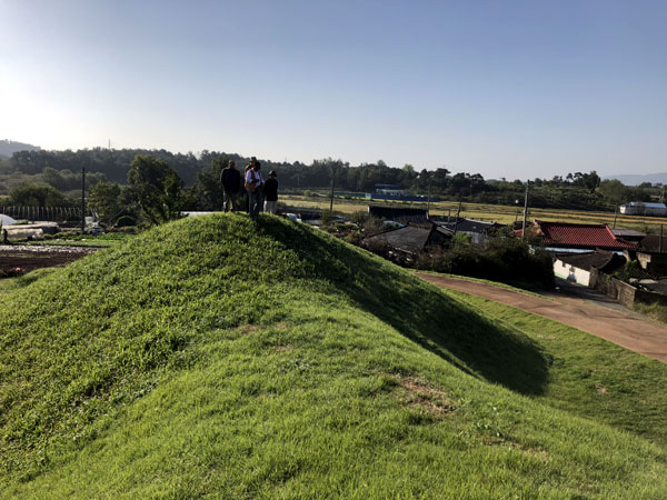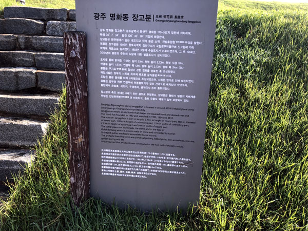안녕하세요, 전라도 광주시내에서 자동차로 서쪽으로 약 20분 거리에 위치한 광주 명화동 장고분은 1994년 국립광주박물관에 의해 발굴조사된 후, 길이 33m, 원형부 지름 18m, 방형부 폭 15m, 방형부 폭 24m로 지금까지 조사된 광주시와 전라남도에서 출토된 전방후원분 중 가장 규모가 작은 고분입니다.