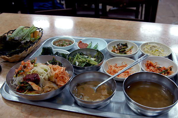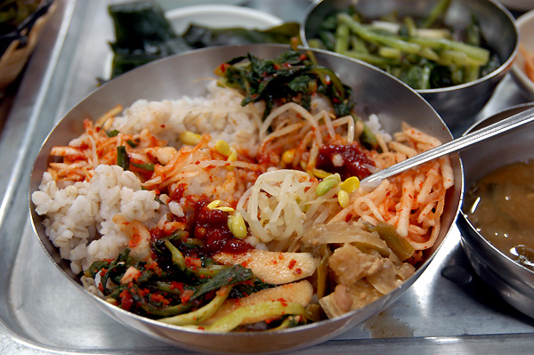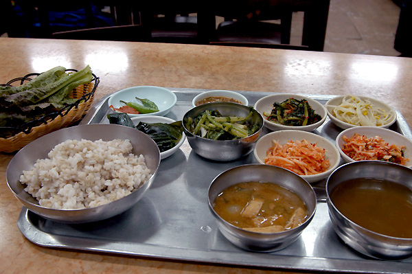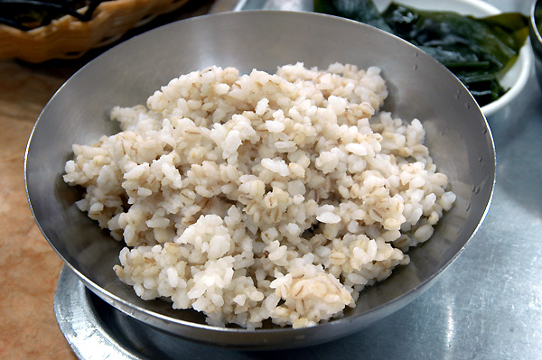 자갈치시장 도로에 위치한 우리보리밥 가게로 들어가서 적당히 자리를 차지하면 찰기가 적고 가벼운 식감의 보리밥이 담긴 큼직한 스테인리스 그릇과 여러 가지 반찬, 신선한 야채, 된장국 등이 큰 쟁반에 담겨 나옵니다.