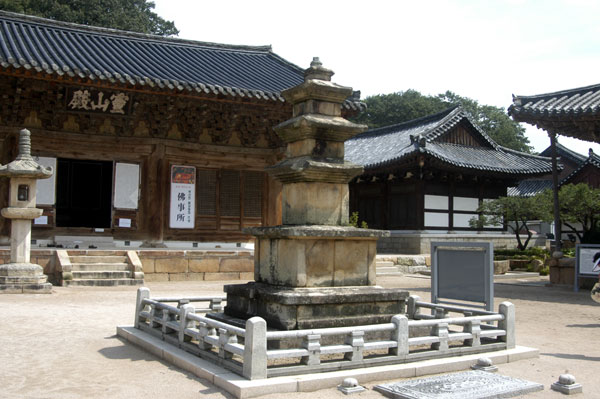 영산전과 그 앞에 있는 삼층석탑, 왼쪽 약사전에서 신자들이 참배를 하고 있습니다.
