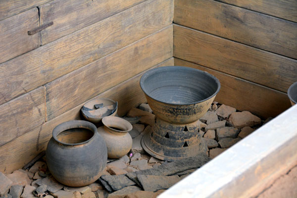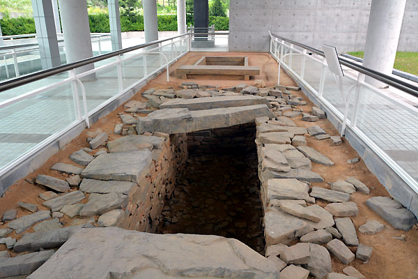 展示館の入口には、阿羅加耶の土器・高杯の花火文様をしている塔と、支石墓、実際の大きさの横穴式石室墳の模型などがあります。