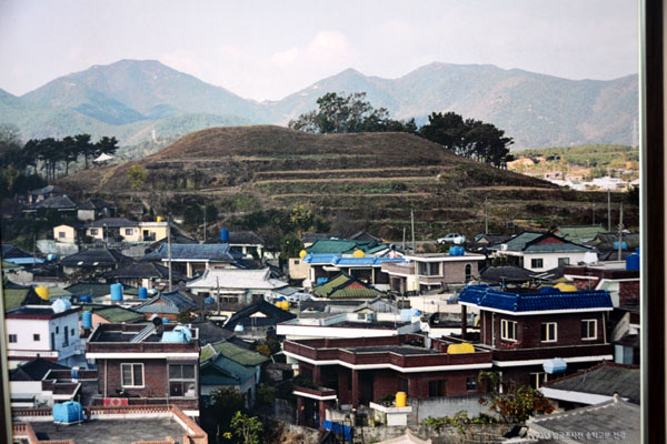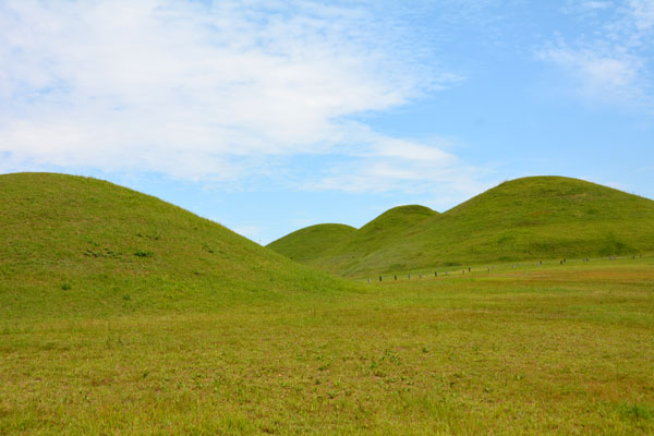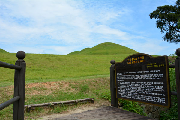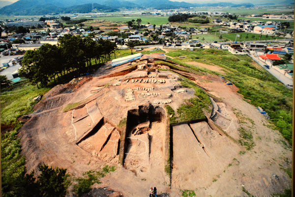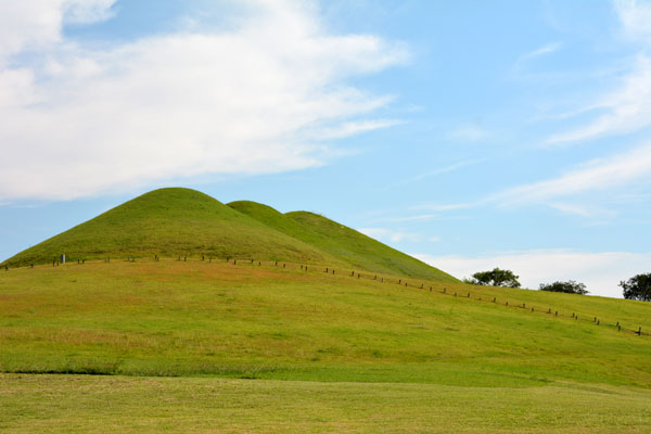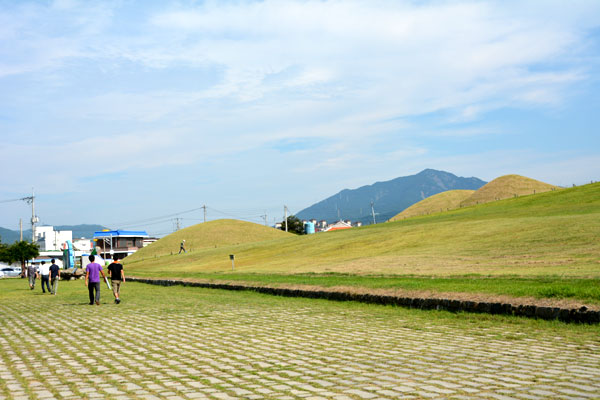 5世紀後半期から6世紀前半期のものと推測している松鶴洞古墳(史跡119号)は、小高い丘陵の上に一番大きい1号墳があり、この古墳の周りには六つの古墳があります。そのうち、南北の長さ66メートルの1号墳は、その形が日本の前方後円墳によく似ているこたから、伽耶諸国にも日本式の古墳が存在していると話題にもなったものですが、1999年から2002年まで実施された発掘調査によって3つの円墳が重なったものだったことがわかったエピソードのある古墳です。