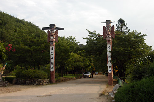 村の入り口には二つのジャンスン(丸太に人の顔を掘ったもの)があり、その横には安東出身の詩人李陸史(1904-1944)の詩碑があります。左手の方に坂を登っていくと道沿いに茅葺きの家や瓦屋の家屋が並び、昔の人々の生活の様子がうかがえます。