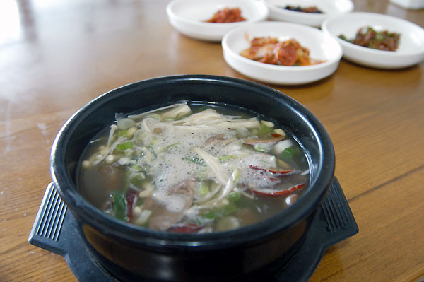 こんな高霊郡に疲れや二日酔いなどによいどんぐりの料理・どんぐりすいとん鍋が美味しい食堂があります。牛の脊椎骨を長時間にかけてじっくりと煮込んだスープに薄きりの牛肉、高麗人参、ナツメ、エノキダケ、銀杏、松の実などの材料をたっぷり入れて煮込むすいとん鍋は、いろんな味と香りが染み付いた栄養食です。