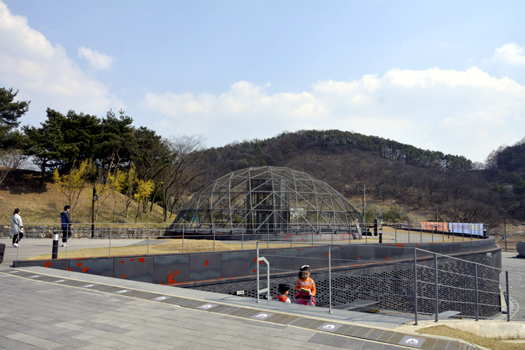 こんにちは、百済歴史遺跡地区の武寧王陵と宋山里古墳群の入口に位置する熊津百済文化歴史館です。2013年7月16日に開館した熊津百済文化歴史館は、公州市に存在する熊津百済時代の遺跡や歴史について物語っています。その規模はそんなに大きくないので30分ほどで見学できます。展示館の外観は武寧王陵のレンガをイメージしてつくられました。観覧料は無料