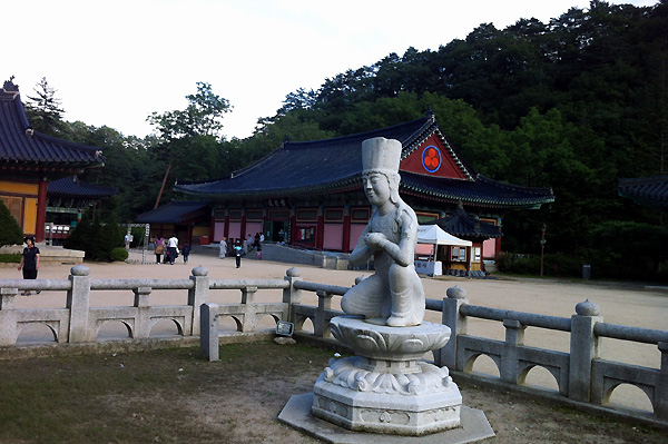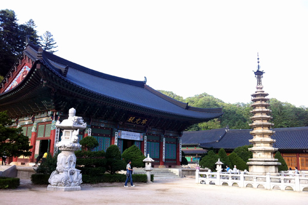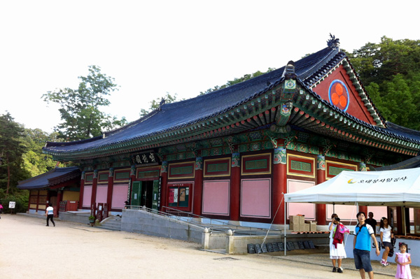 江原道 平昌郡の北部にある海抜1,563メートルの五台山国立公園(オデサンクンニッコンウォン)の南東側の谷間に位置する月精寺(ウォルチョンサ)は、643年、新羅(シルラ)の善徳女王(ソンドッヨワン)時代に創建されたお寺です。一柱門(山門)から本堂まで一キロほど続く自然豊かな杉の林道があり、そこを通り抜けたら天王門がありますが、そこの境内を入ると本堂にあたる寂光殿の前には高麗時代につくられた国宝第48号の八角九層石塔があり、近くにある聖宝(ソンボ)博物館には高麗時代の宝物第139号の石造菩薩座像(薬王菩薩像)などの重要な仏教文化財が展示されています。
