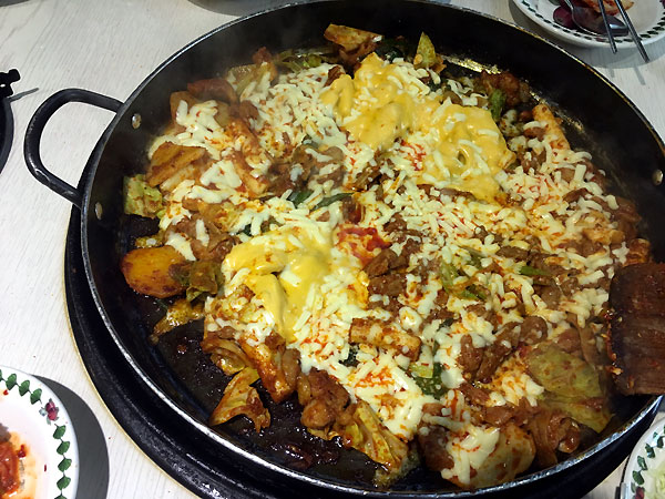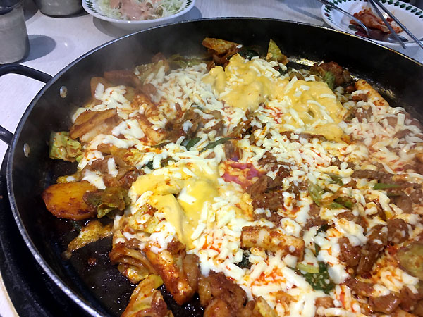 こんにちは、釜山南浦洞のBIFF広場で営業しているユガネタッカルビ南浦店のチーズタッカルビです。鉄板で炒めた野菜とタッカルビの上にチーズをまいて食べるチーズタッカルビです。チーズをかけたタッカルビは柔らかく食べやすかったんでした。